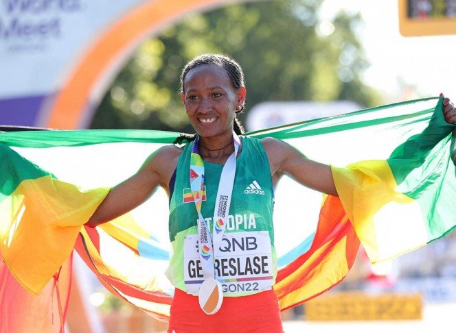 EUGENE, EEUU, 18 JULIO 2022.- Gotytom Gebreslase se proclamó este lunes campeona mundial de maratón coronando un doblete de Etiopía en Eugene-2022 tras el triunfo