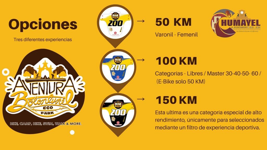 Esta prueba tendrá distancias de 50 y 100 Kms. para las categorías de 18 años en adelante, Libre, Máster de 30, 40, 50; y 60 años y mayores. La distancia de 150 kilómetros será sólo para la categoría “Elite”, en las ramas varonil y femenil.