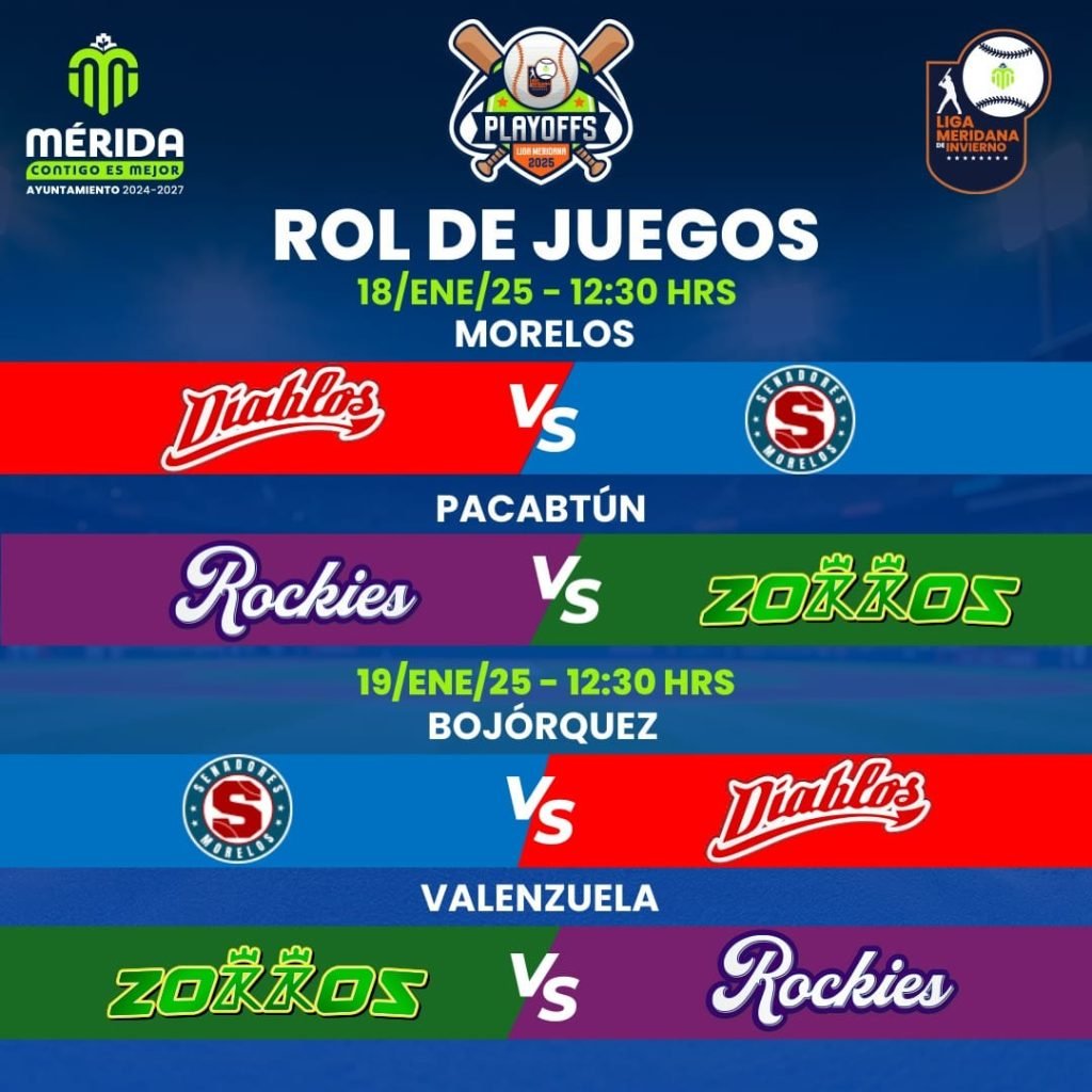 ENERO 17, 2025.- Los Diablos de la Bojórquez (10-13) se verán a los líderes Senadores de la Morelos (17-6) y los Rockies de San José Tecoh (12-11) a los sublíderes, los Zorros de Pacabtún (13-10) en los duelos de ‘Playoffs’ de la Liga Meridana de Invierno de béisbol, Temporada 2024-2025, que organiza el Ayuntamiento de Mérida.