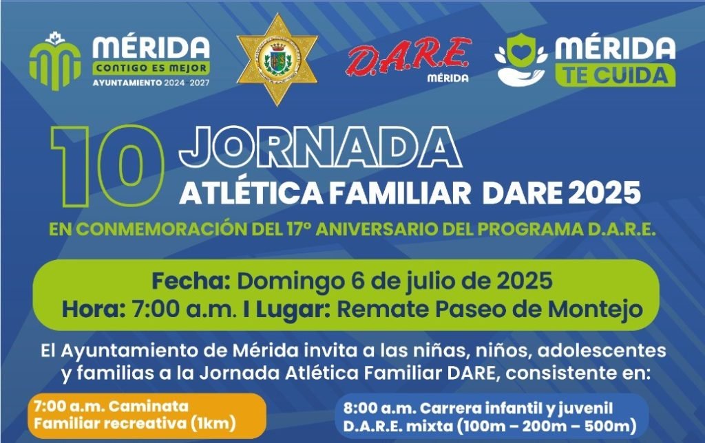 MÉRIDA, YUC. 17 JUNIO 2025.- Con el propósito de promover el deporte como una actividad de convivencia familiar y constituir una herramienta importante para prevenir el consumo del alcohol y las drogas entre las niñas, niños y adolescentes, el domingo 6 de julio se llevará a cabo la 10a. Jornada Atlética Familiar D.A.R.E. 2025.