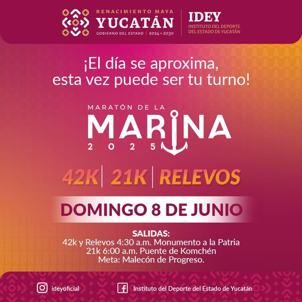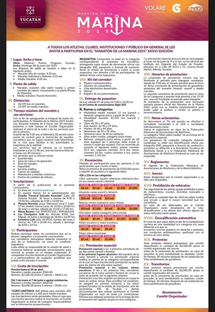 MÉRIDA, YUC. 1 ABRIL 2025.- Con una bolsa económica de 350 mil pesos a repartir entre los ganadores de las categorías participantes así como la prohibición tajante de vehículos, motocicletas, scotters, bicicletas y en general, cualquier artefacto que facilite la ayuda a los corredores, el Instituto del Deporte del Estado de Yucatán, finalmente publicó en sus redes sociales la convocatoria para el Maratón de la Marina 2025.