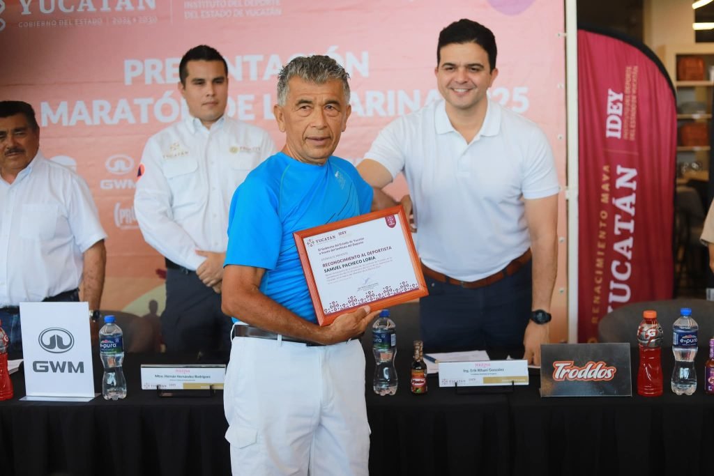 MÉRIDA, YUC. 27 MAYO 2025.- El Comité Organizador del Maratón de la Marina entregó reconocimientos a los corredores que comenzaron con la tradición de los maratones hace 50 años, encabezados por Raúl Fernando Díaz Martín, quien corrió de Mérida a Progreso en el marco de la presentación de avances del Maratón de la Marina 2025.